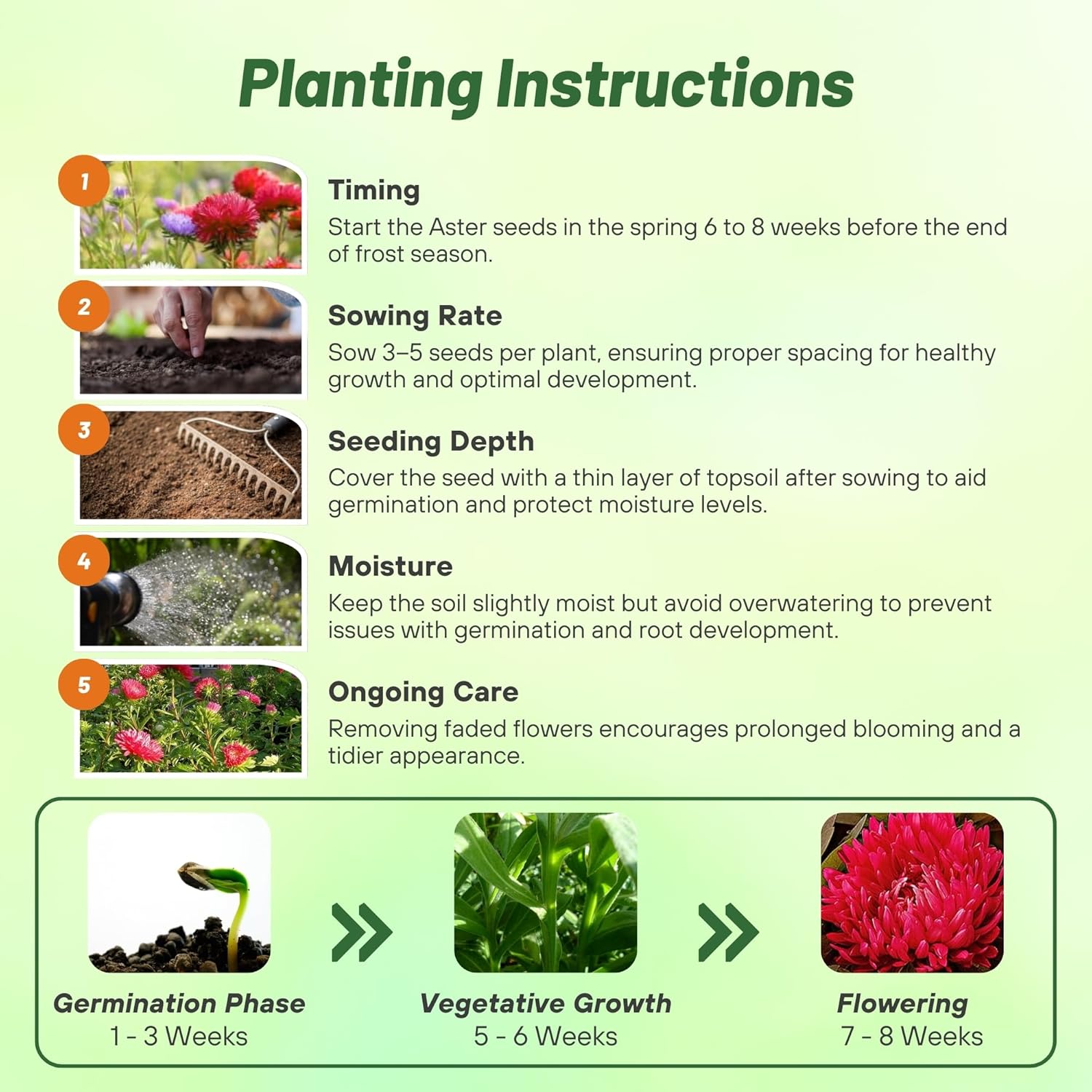Sow 6–8 weeks indoors before transplanting out. To avoid short stems, establish plants early. Heat and reduced daylength initiate flowering. Pinching is not required.