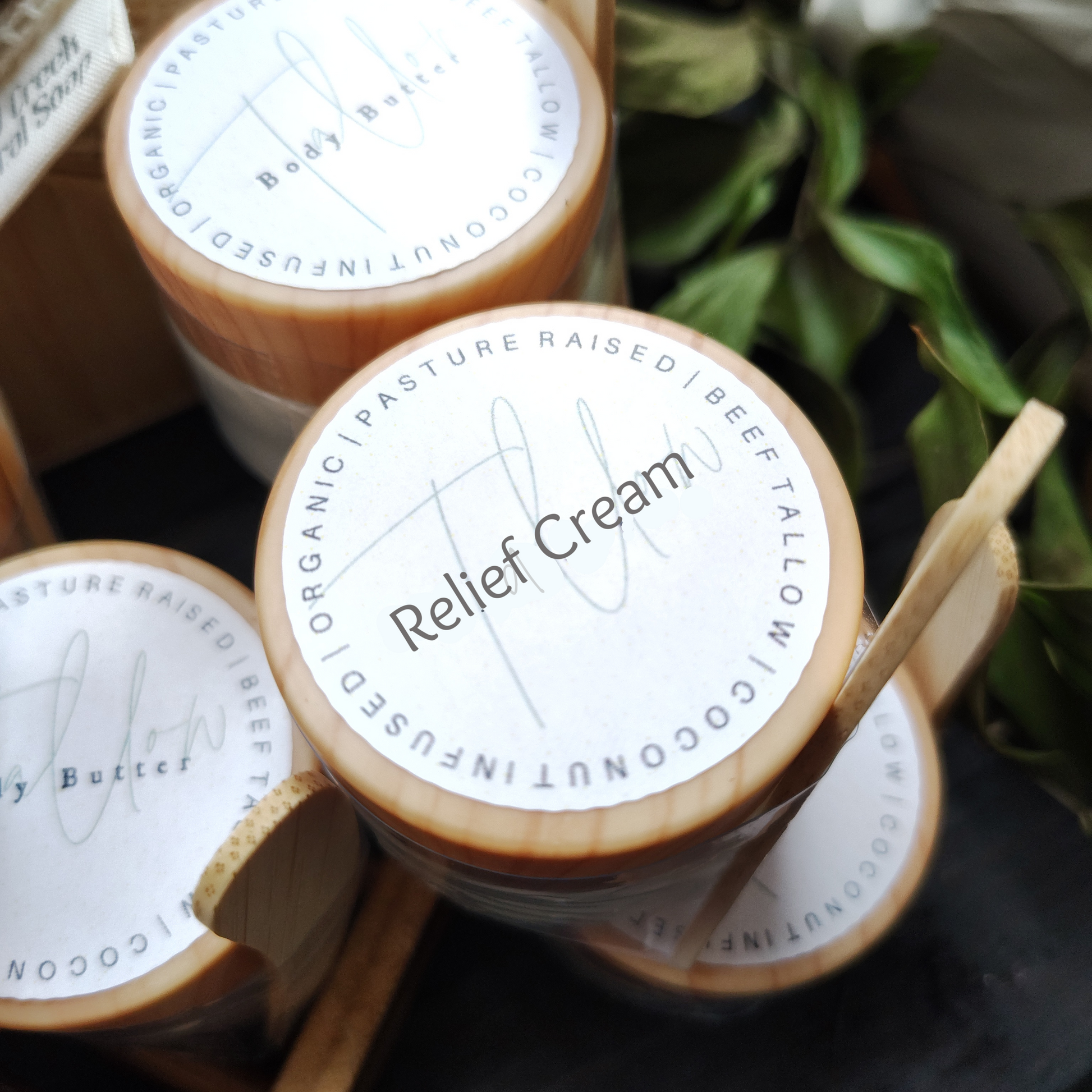 Our Relief Cream is filled with nourishing organic Pasture Raised Beef Tallow, Jojoba Oil with skin-loving essential oils to soften, soothe, and help the skin. Packed with antioxidants from organic herbs & vitamins! The perfect blend of vitamin-rich nourishing tallow and therapeutic essential oils makes this best-selling Skin Nourishing Cream effectively and effortlessly melt into skin. Helps rebuild moisture and balance the microbiome with a mild, sweet, grounding aroma.